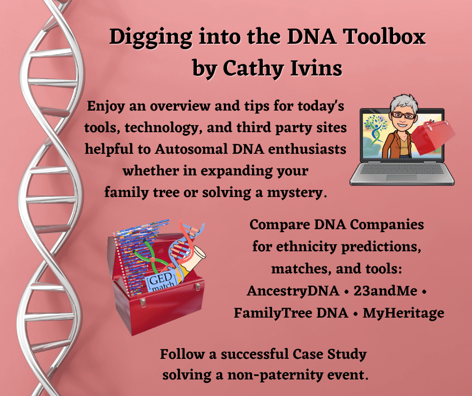 Genetic/Forensic Genealogist Cathy Ivins will present an Introductory DNA program to help you determine the right test and testing company for your specific wants and needs, whether you are a “Newbie” and need help understanding results or a “Wannabe” curious what a DNA test can do for you, including: