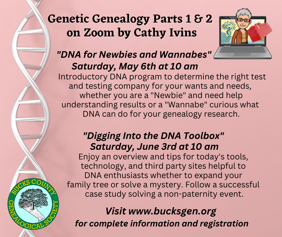Upcoming Genetic Genealogy Lectures in two parts, on Zoom for Bucks County Genealogical Society: