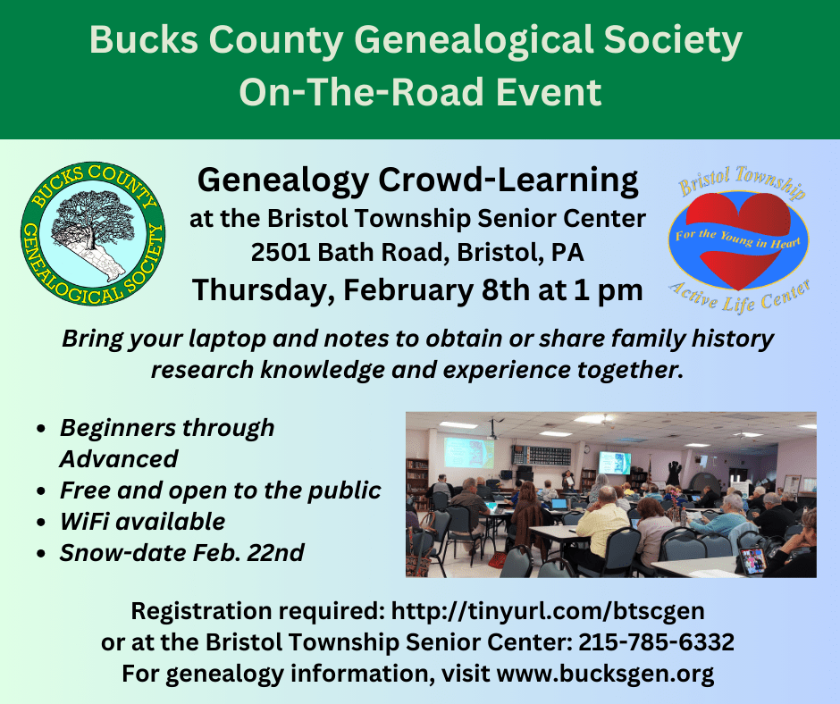 • Want to learn more? Visit www.bucksgen.org and click on “beginners” on the left column. There you will find a video I created which walks you through how and why we do genealogy. And the page has all the links you need to get started.